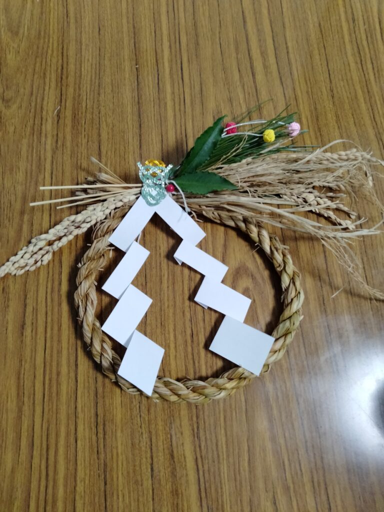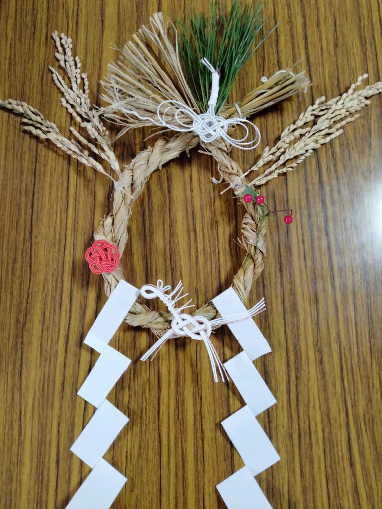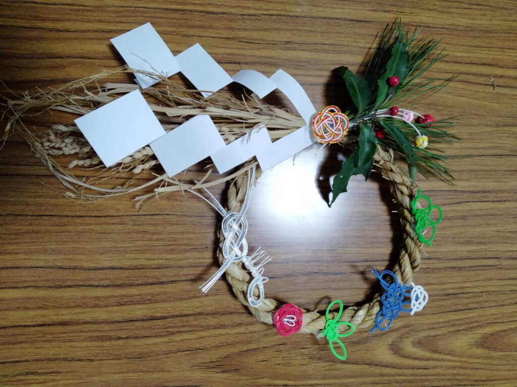 藁を叩いて柔らかくする作業がなかなか大変、なうときは向きに注意、いろいろな水引もあり、赤や緑などの色の配置など悩みつつ、オリジナルのしめ飾りが完成しました。